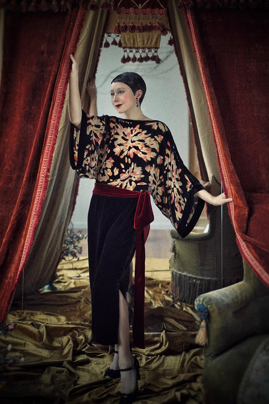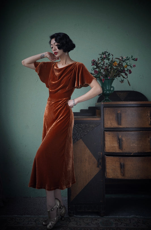 1930s|Cap Sleeve Velvet Asymmetrical Dress (Orange)