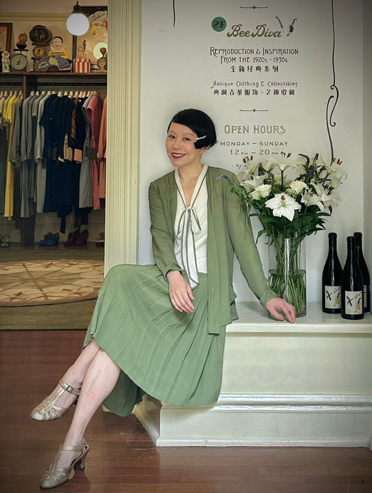 1920s|Lace Ribbon Green Pleated Two-Piece Set