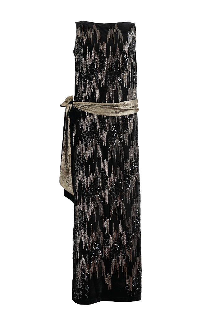 The black velvet is adorned with gold sequins of varying sizes, creating a dazzling Art Deco pattern. The fabric is soft with a slight stretch.