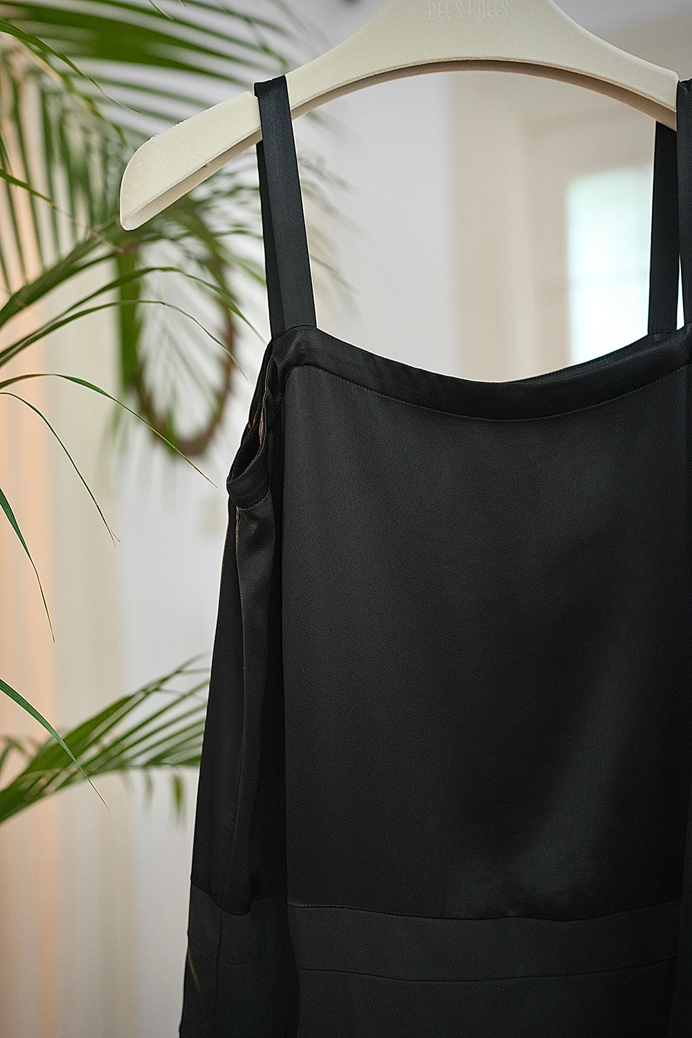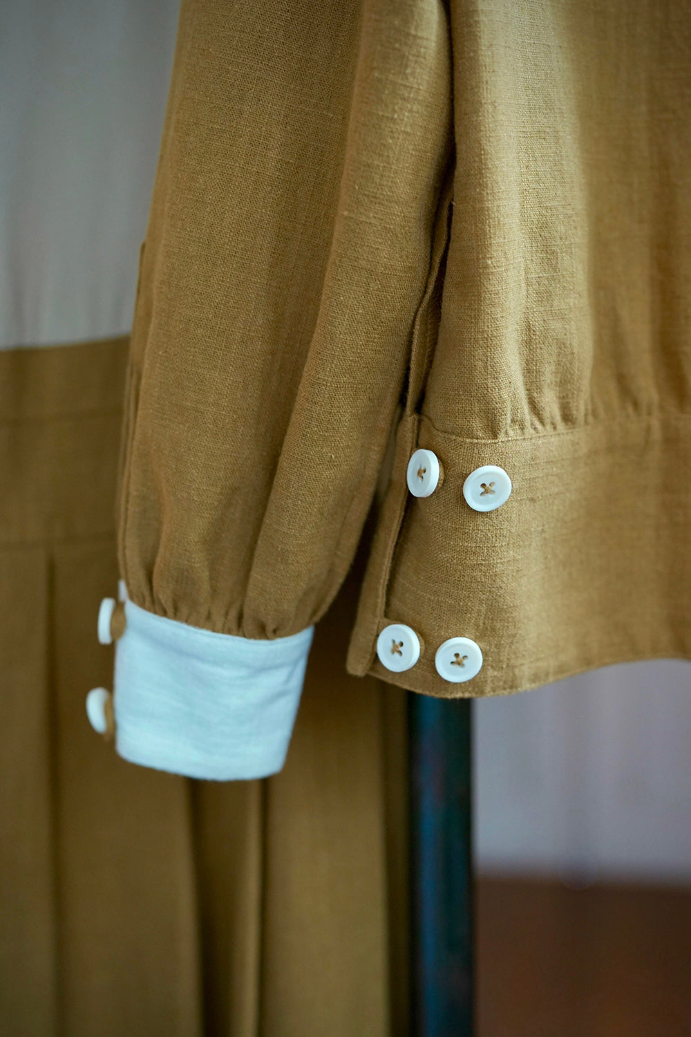 The set includes a slip dress and an oversized cover-up, which can be worn together or styled separately for versatile pairing. Available in two colors: heavyweight ramie-cotton mustard yellow and lightweight linen-rayon black.