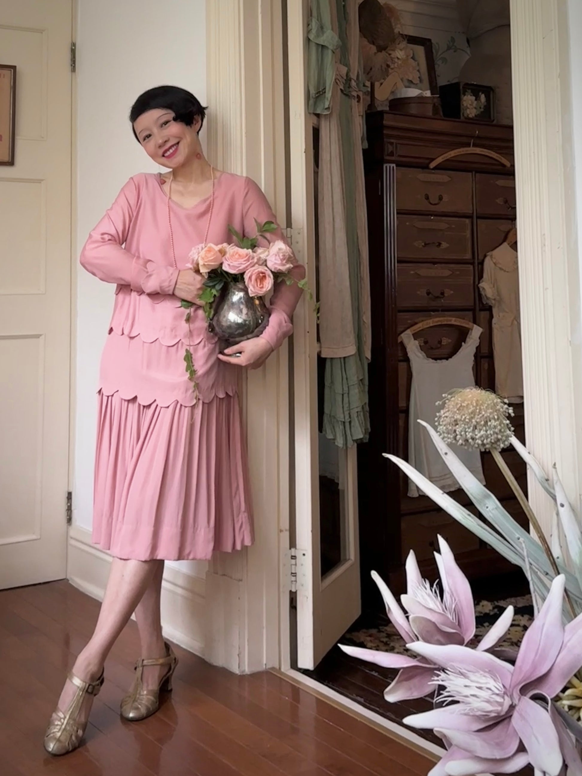 Crafted from lightweight, breathable acetate fabric that floats effortlessly. The sophisticated pink-and-green hue combination offers timeless elegance. After multiple pattern adjustments, the waistline and hem length now perfectly capture the mid-1920s modern silhouette while ensuring universally flattering wear.